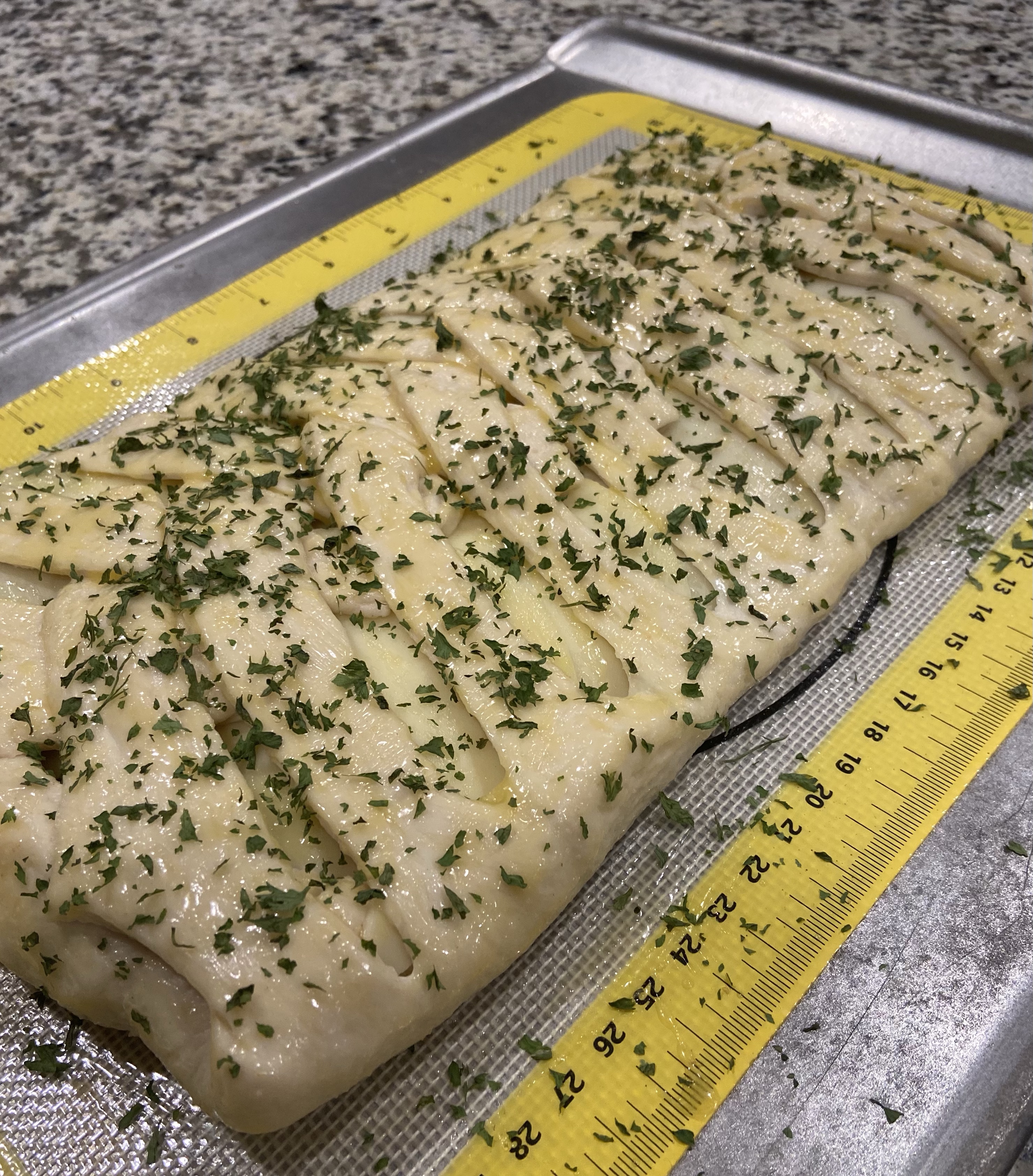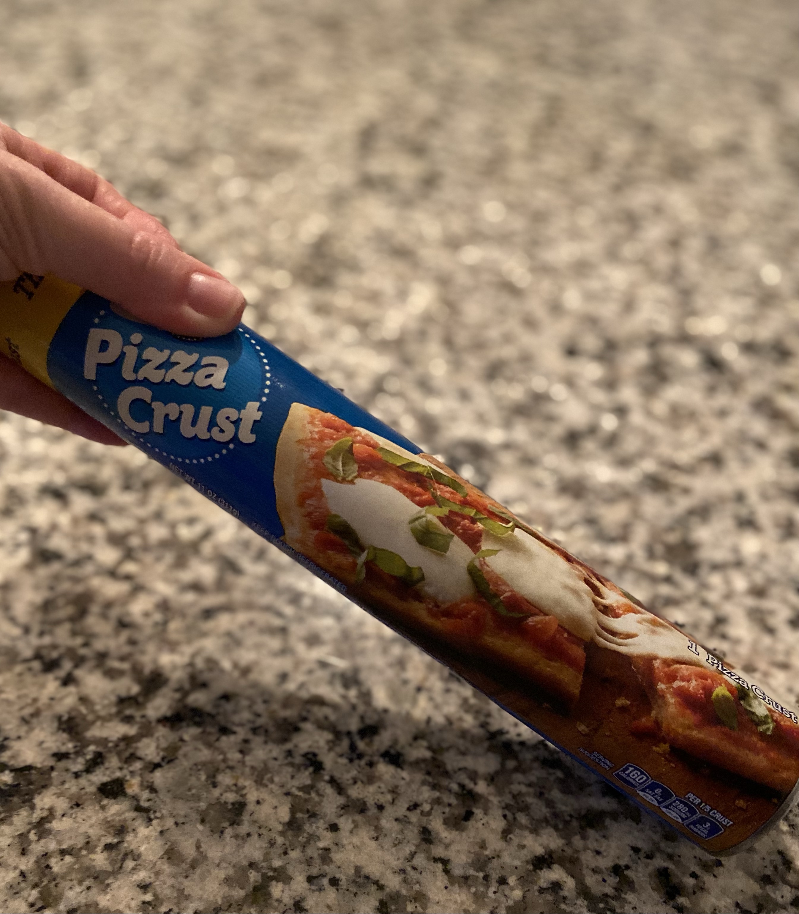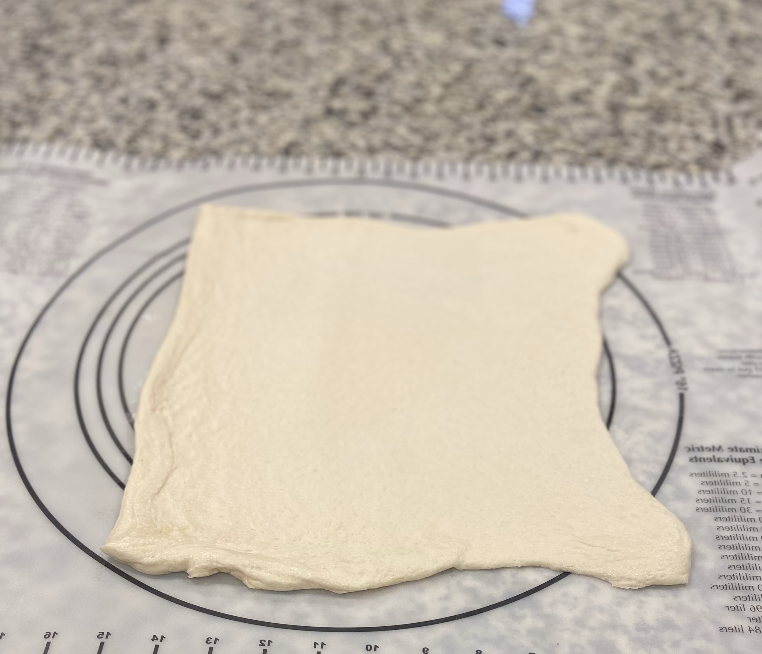 - Unroll the pizza dough, but leave in the rectangular form. Stretch it out using a rolling pin (keeping its rectangular shape).