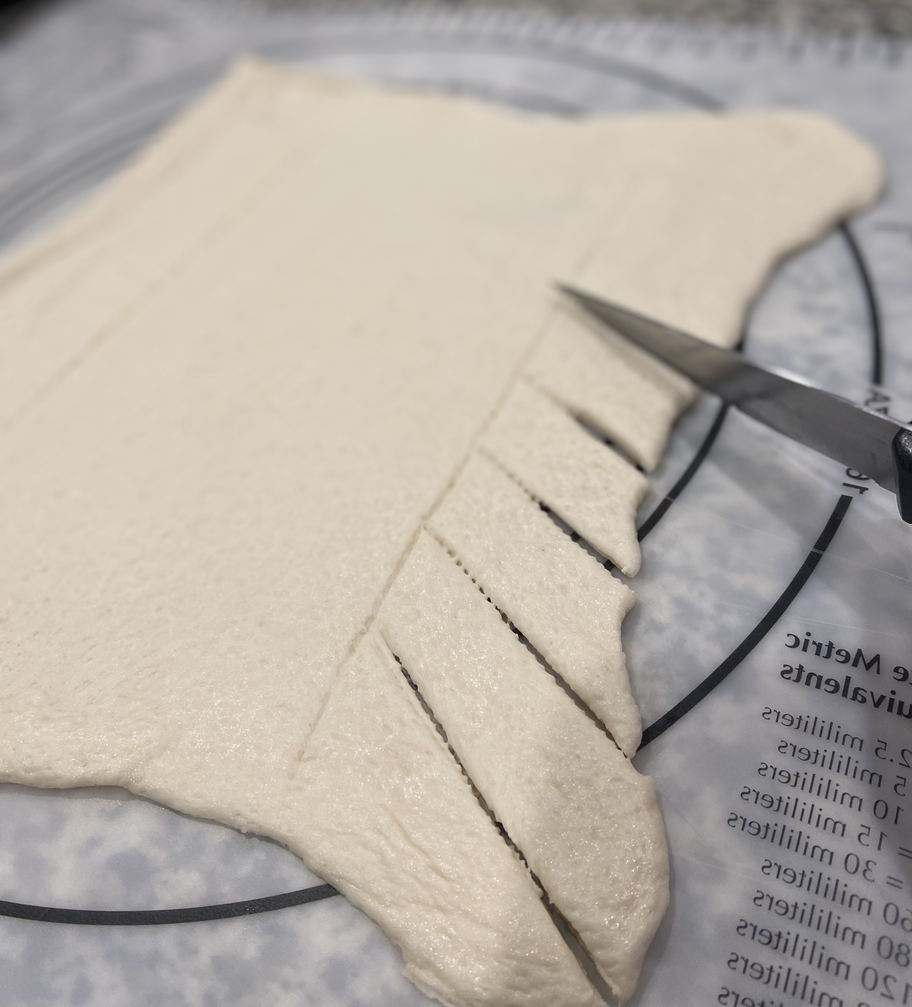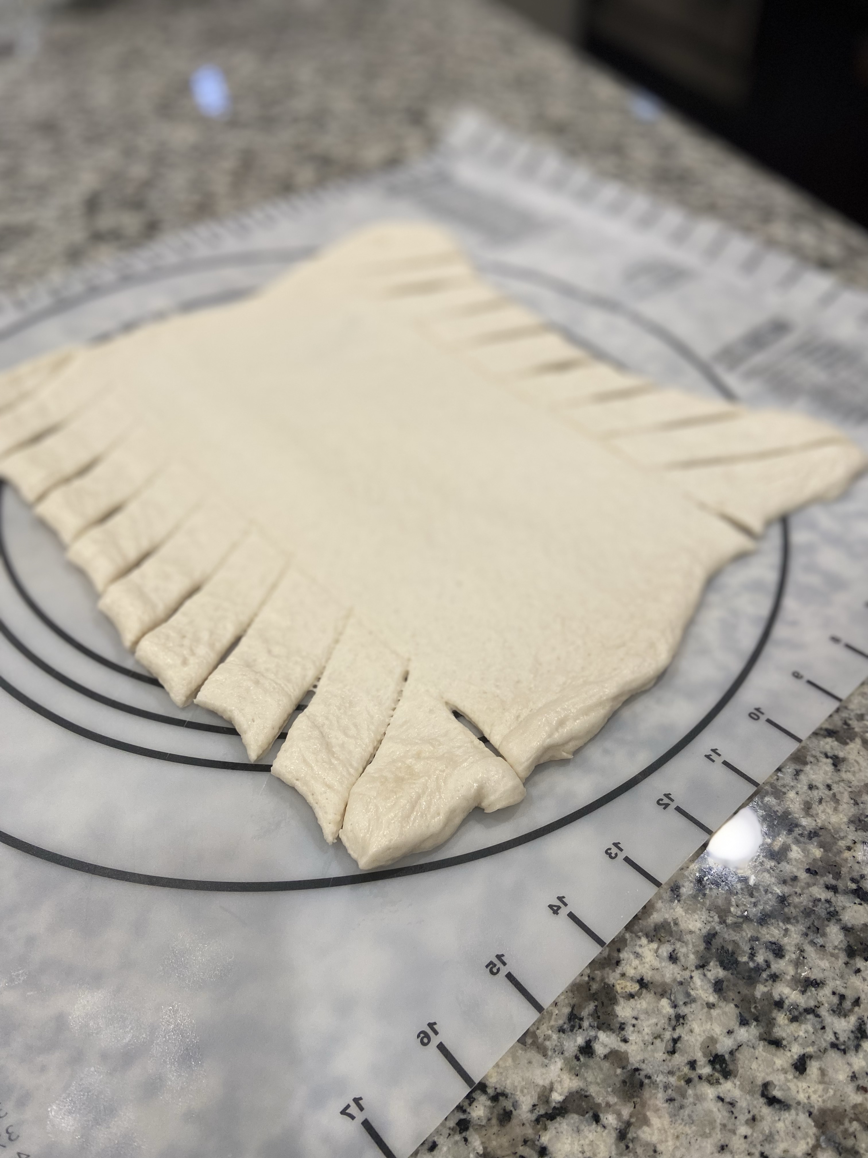 - Cut 1” angled strips along each side of the rectangle leaving about 6-8” in the center for the fillings.