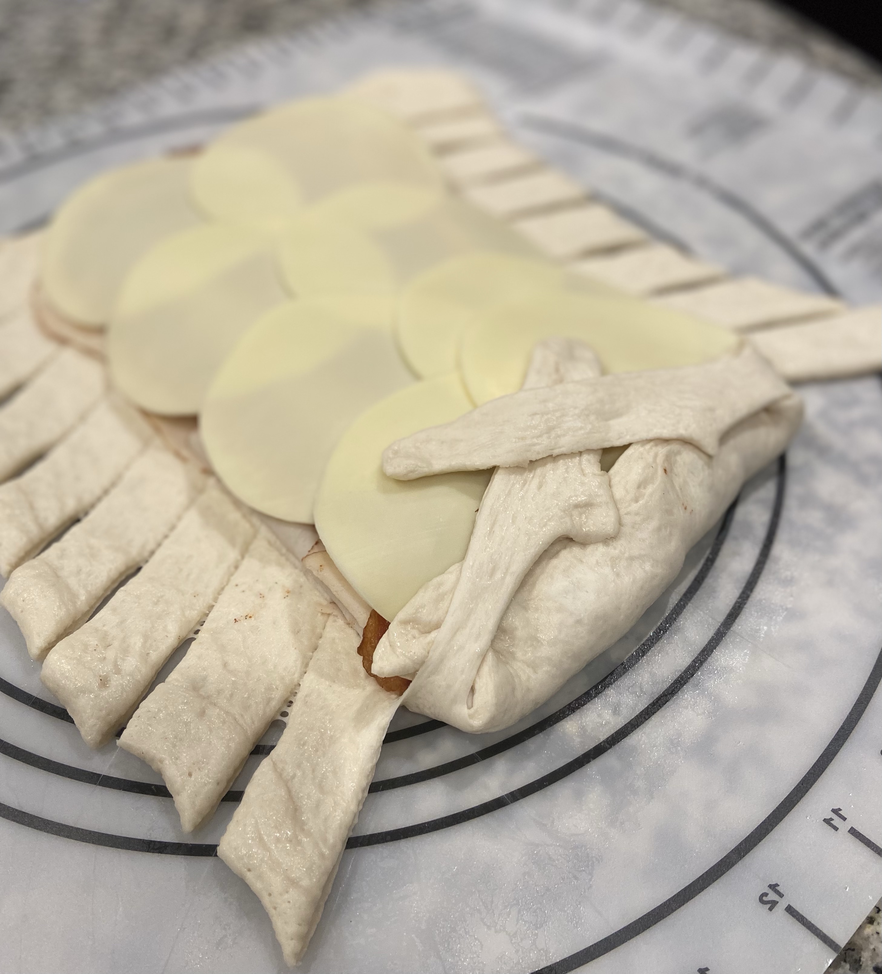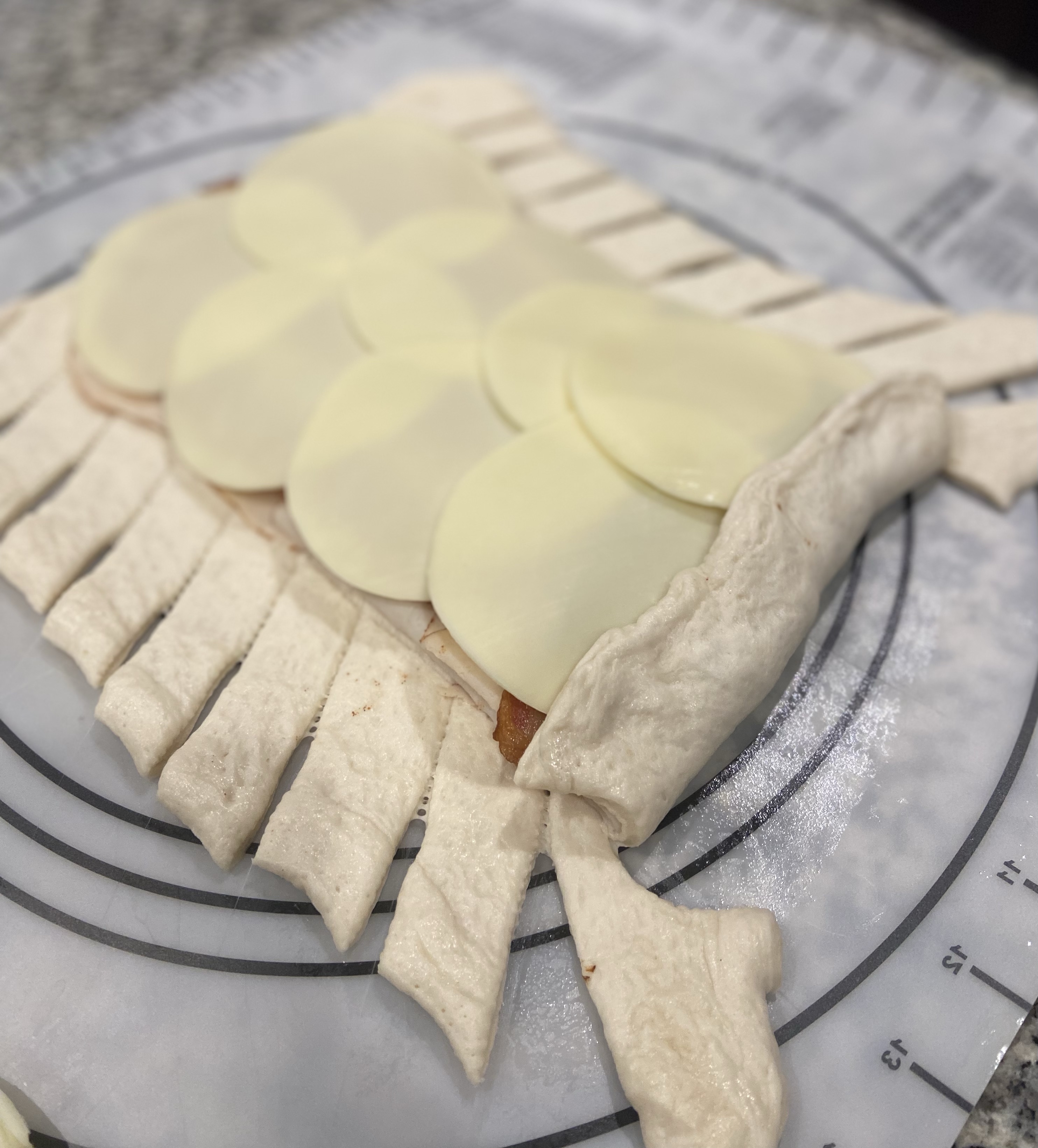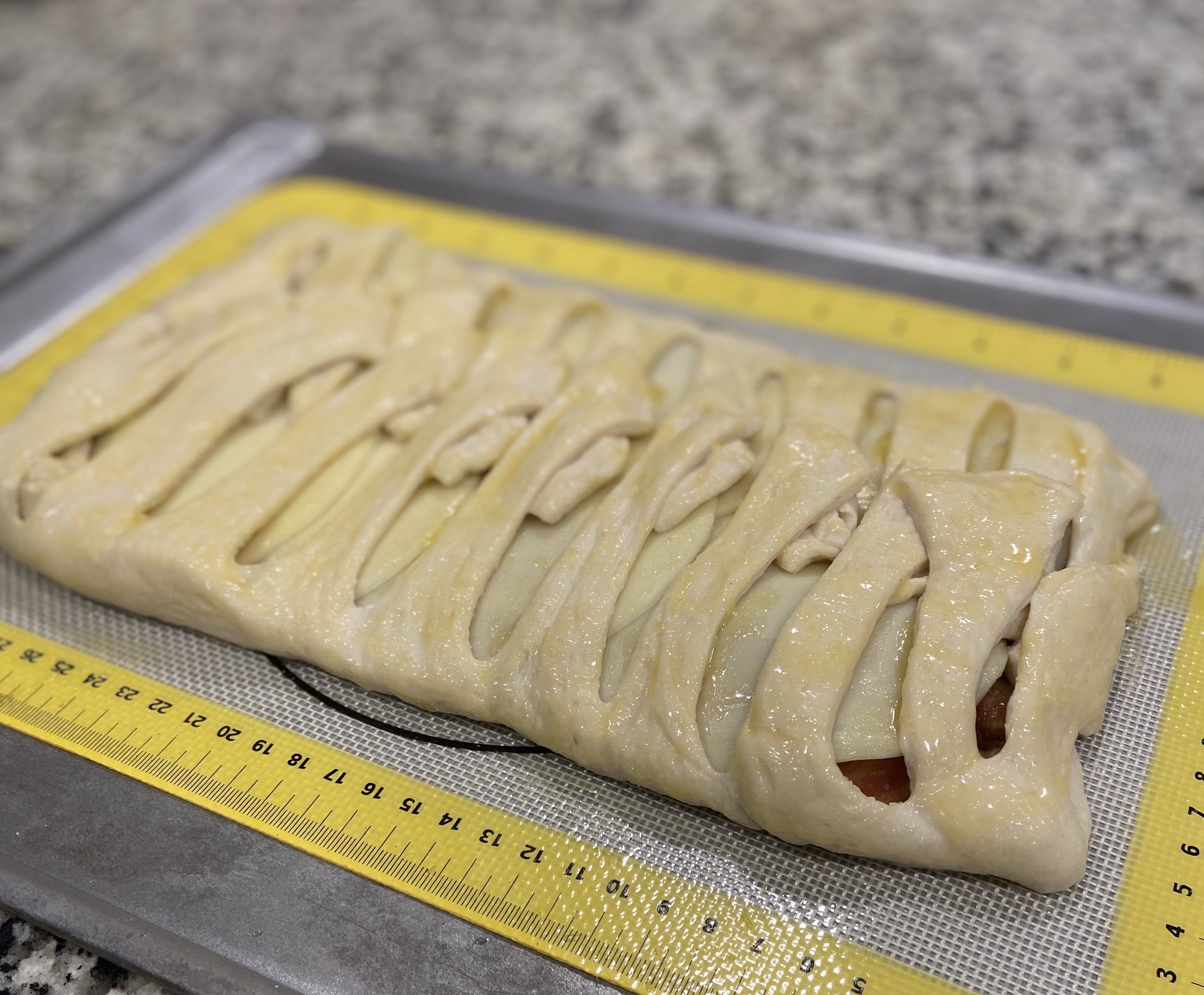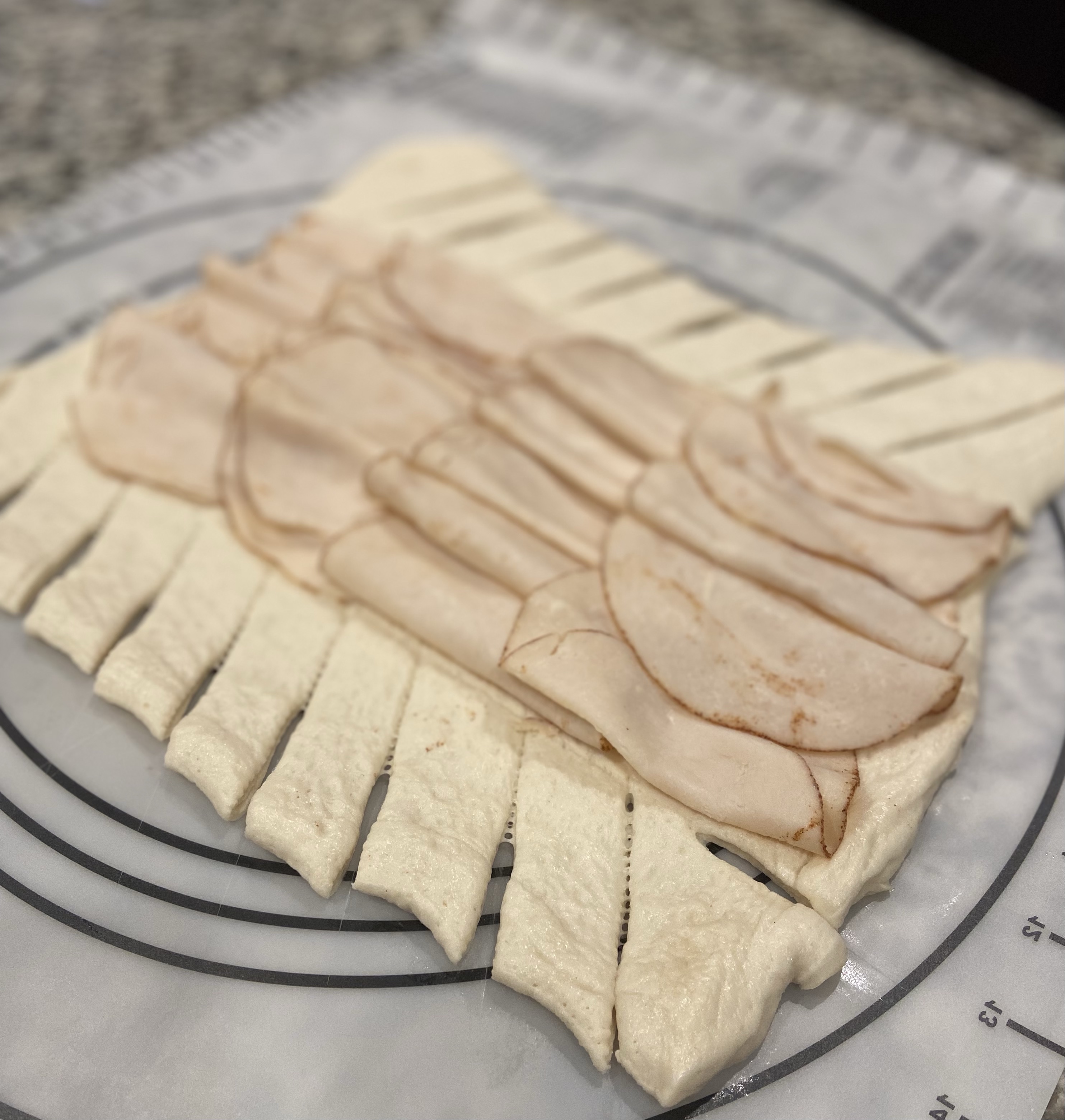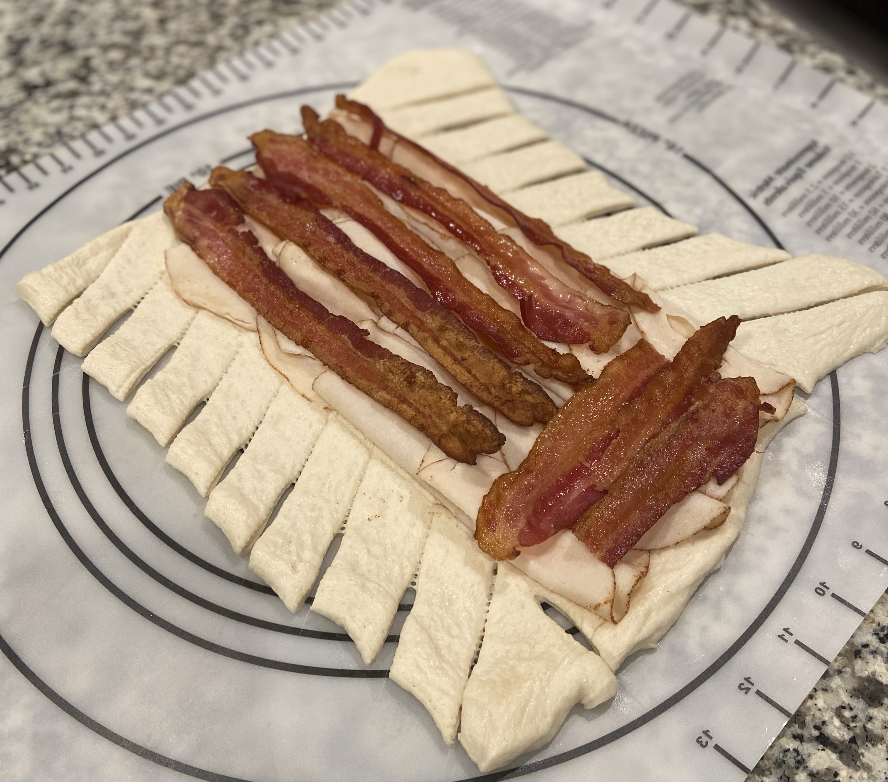 - In the center add turkey, bacon and cheese. Fold up the bottom center over the fillings and begin braiding the 1” strips.