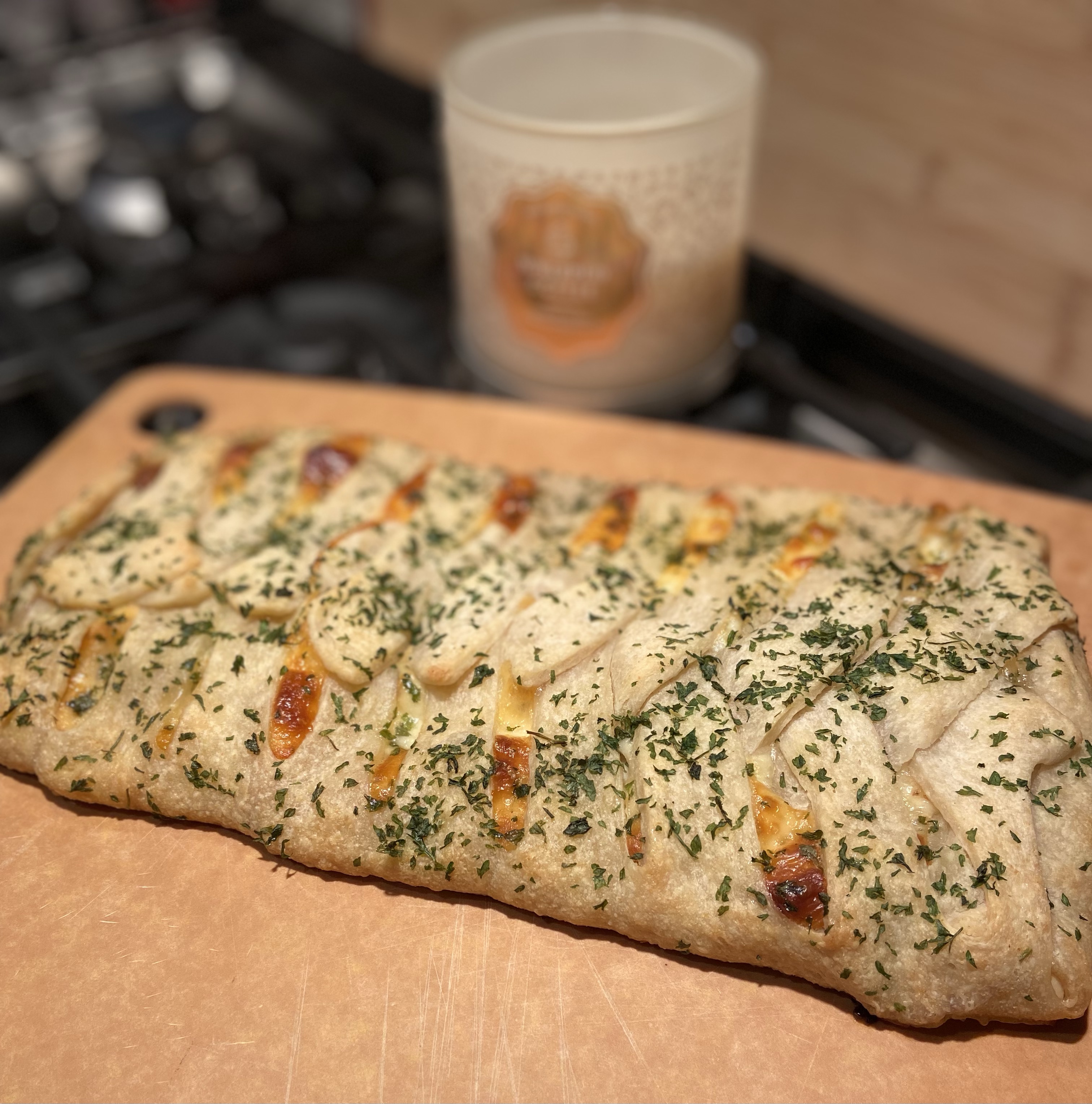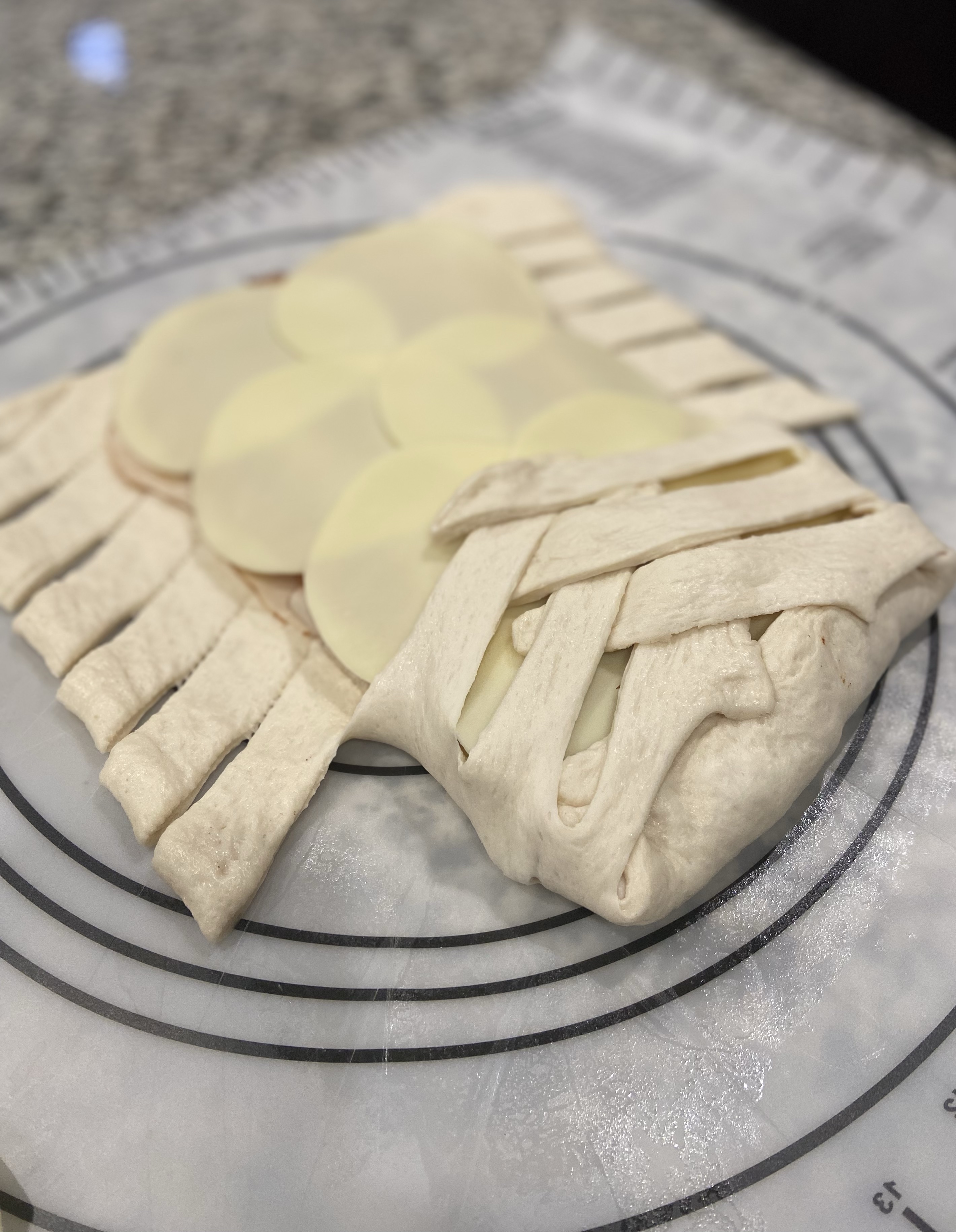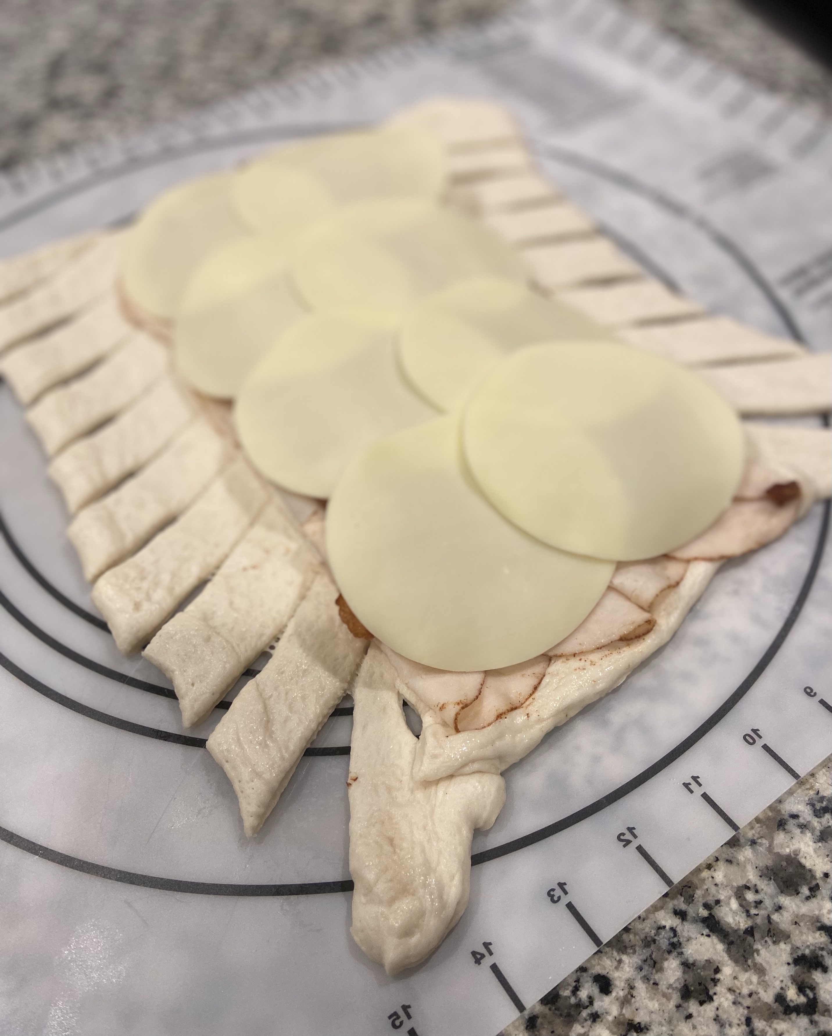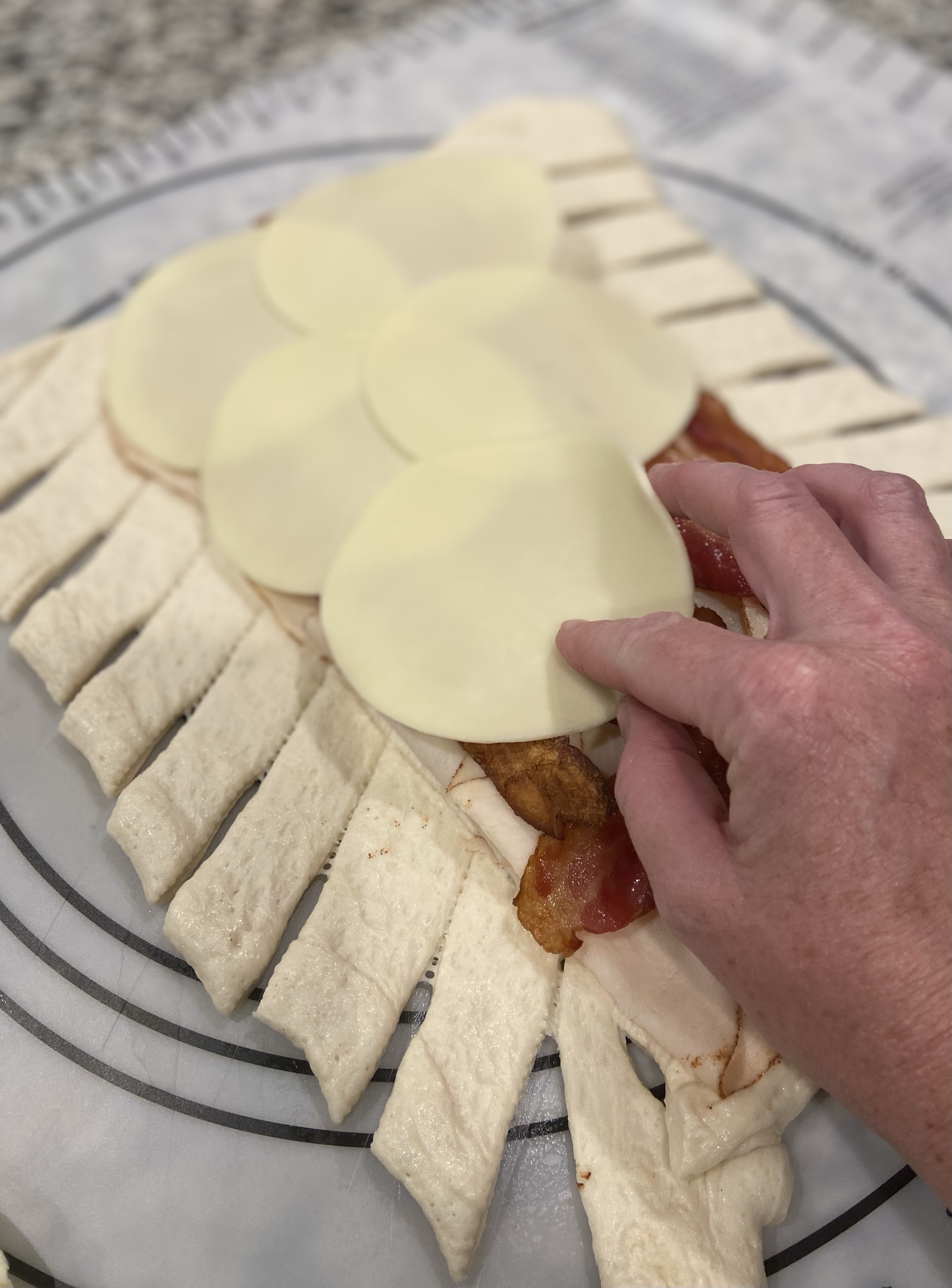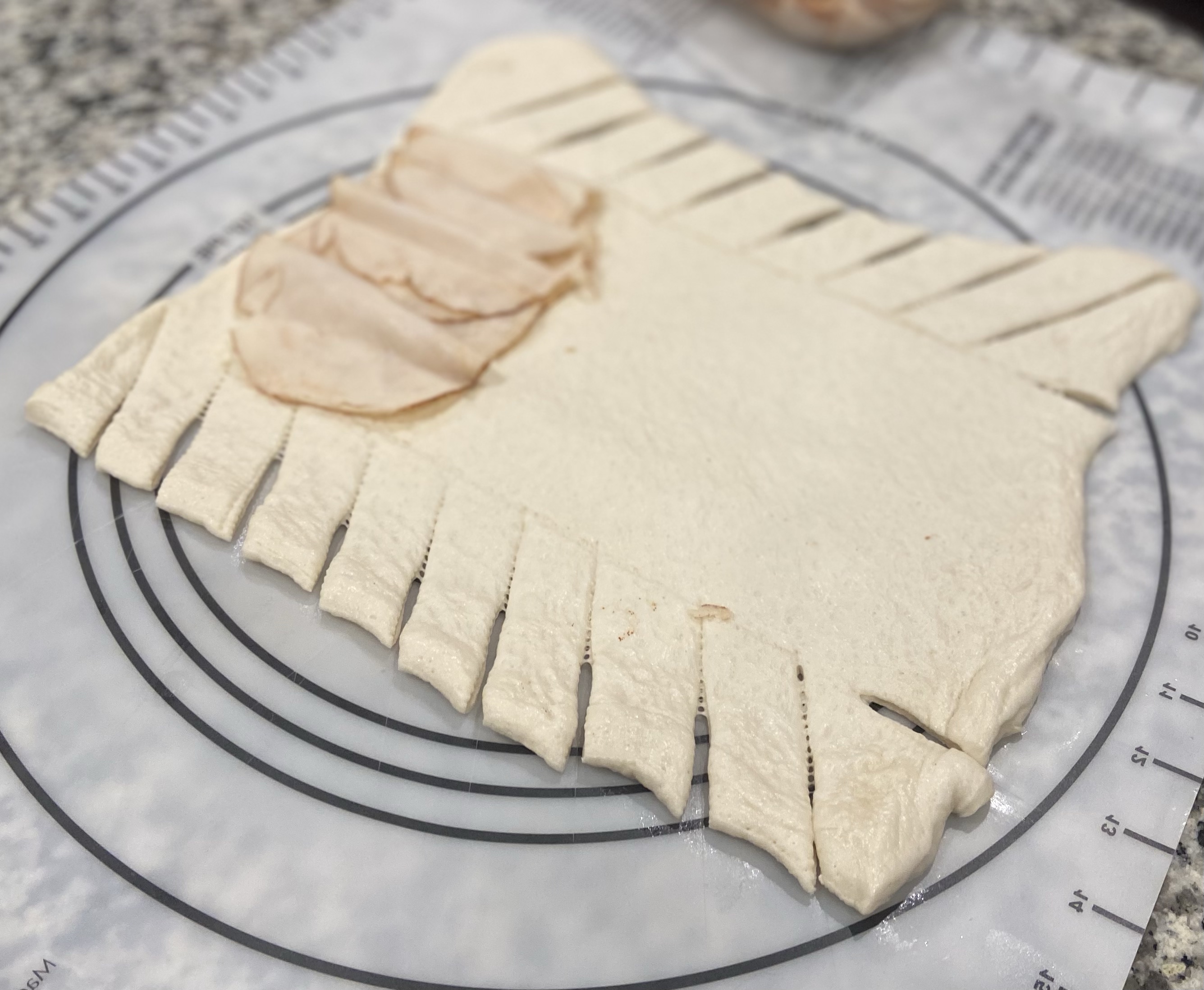 - In the center add turkey, bacon and cheese. Fold up the bottom center over the fillings and begin braiding the 1” strips.