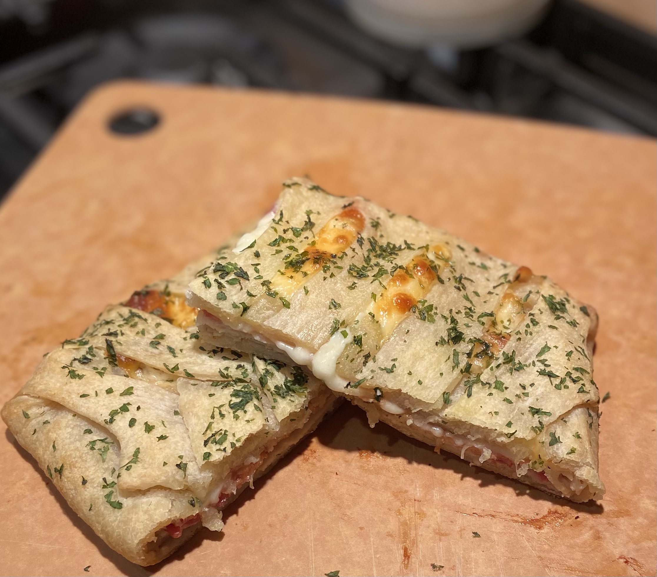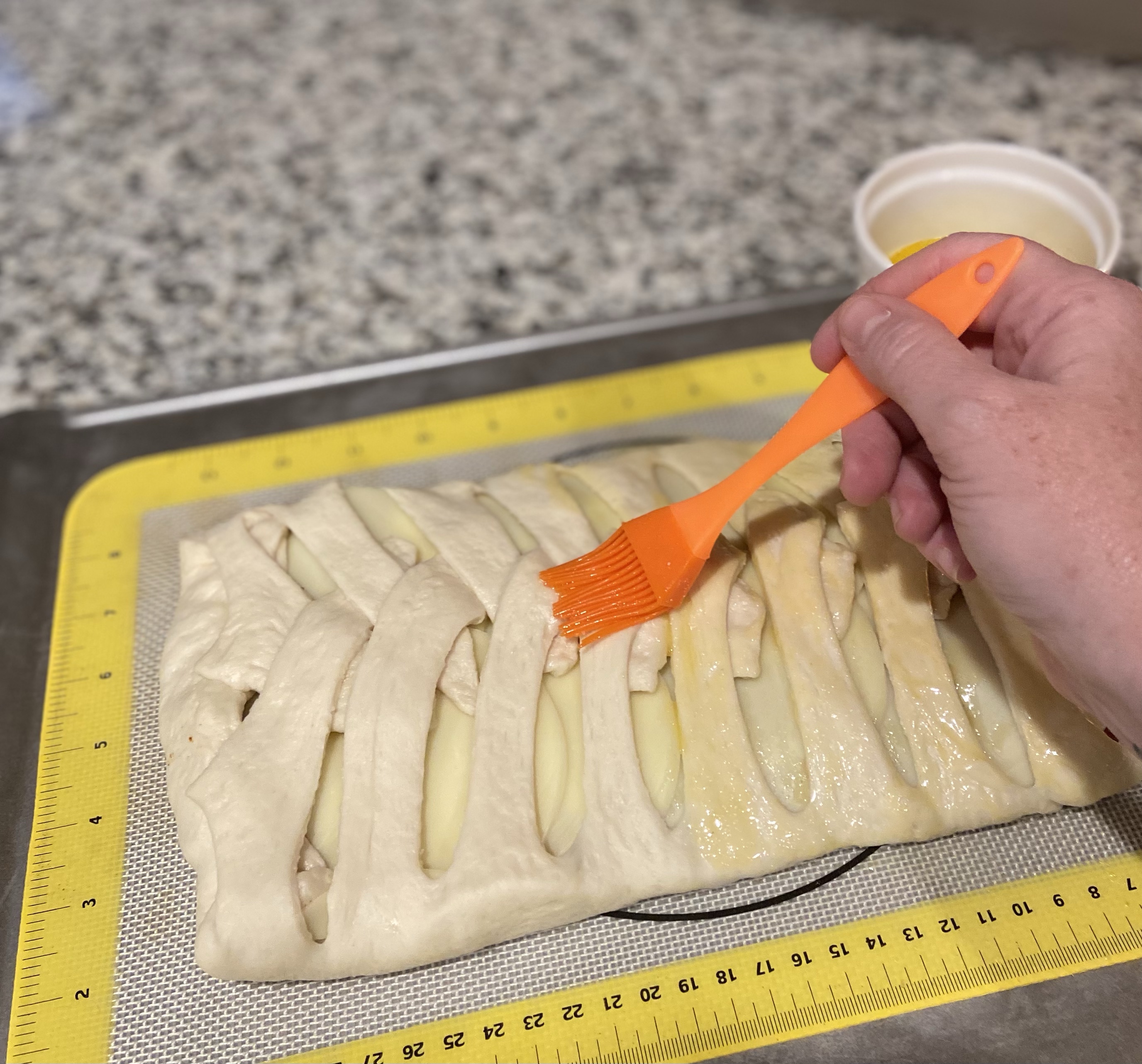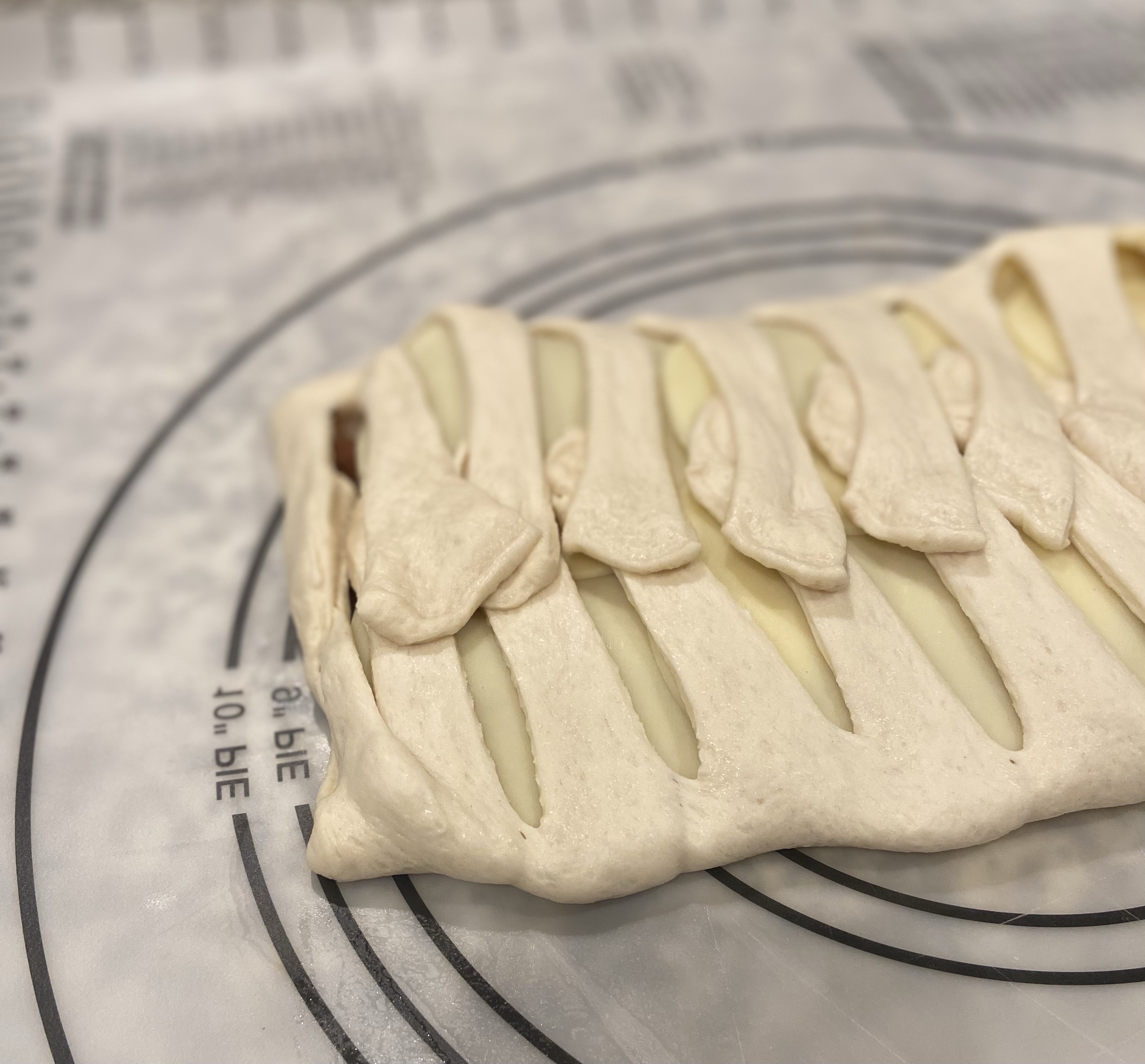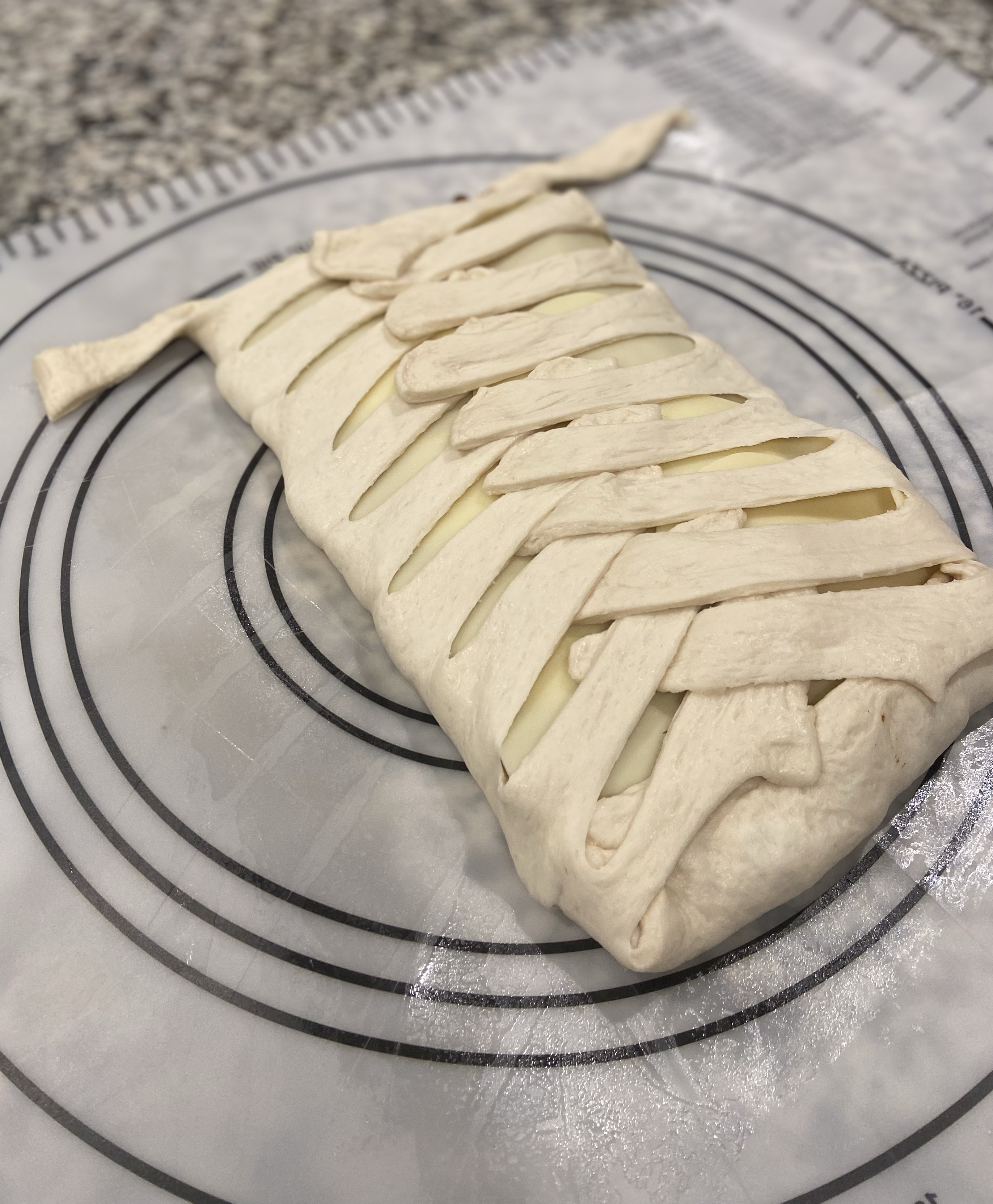 - Cross the strips all the way up the panini. Once you reach the top fold the top over the last two braids.
