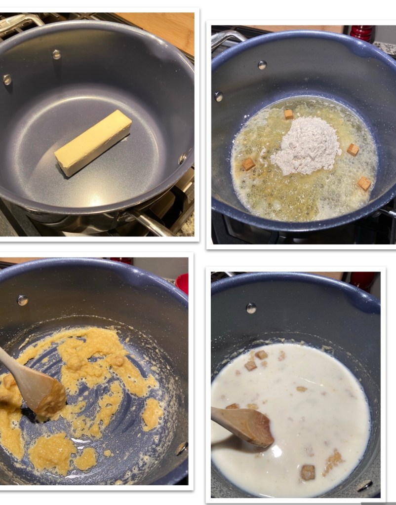 In a Dutch oven, melt butter. When HOT add flour and chicken bullion cubes then stir until blended. Gradually add milk and bring to a boil.