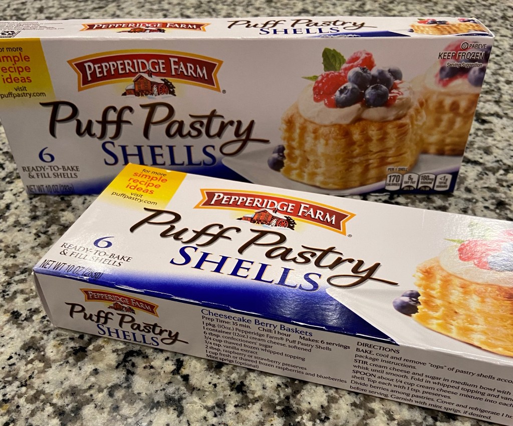 Puff Pastries: 2 boxes of Pepperidge Farm puff pastry shells (frozen) and place on a Cookie sheet and bake @ 425°F for 10-12 min.