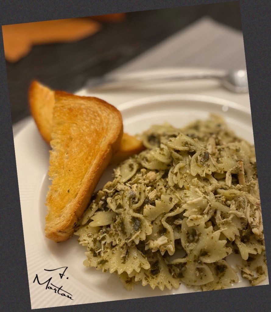 - Once pasta is tender, drain and add the olive oil, pesto sauce and chicken. Mix well and serve with garlic bread. Top your pasta with grated Parmesan cheese, if you choose.