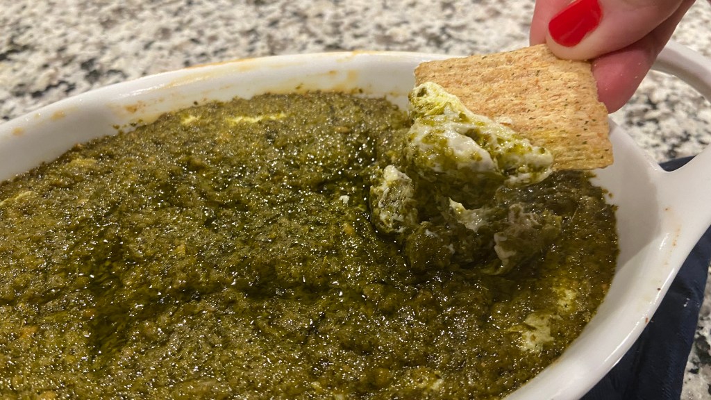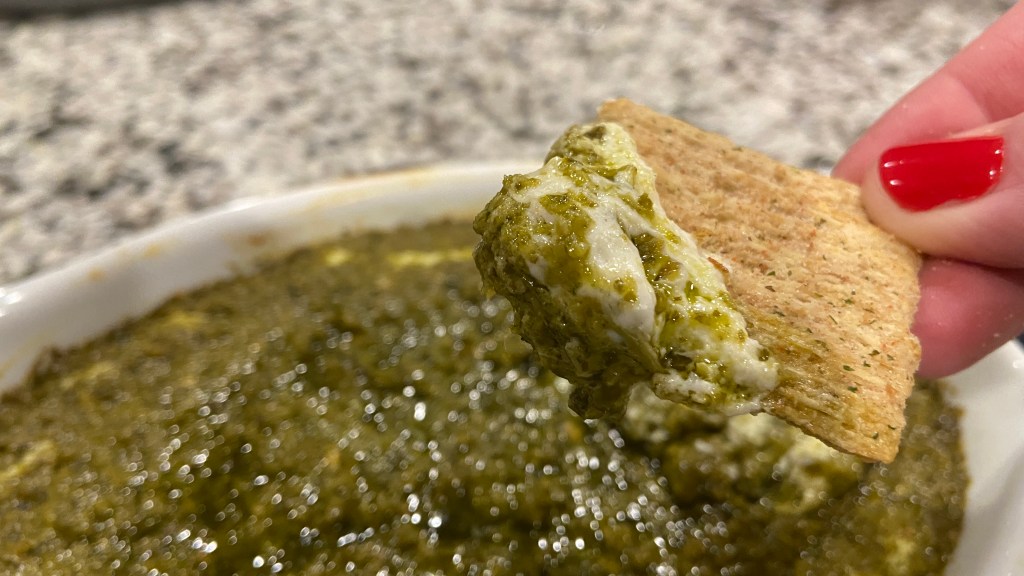 Preheat oven to 350 degrees f. In an 8 inch pie plate or your favorite baking dish that is comparable, spread cream cheese evenly. Next spread a thin layer of pesto and then top with tomatoes. Bake on middle rack of oven for approximately 20 to 25 minutes, until it begins to bubble or the cheese at the edge of the baking dish begins to turn a light golden brown. Remove and serve warm with your favorite crackers, pita chips, baguette or raw vegetables. Enjoy!
