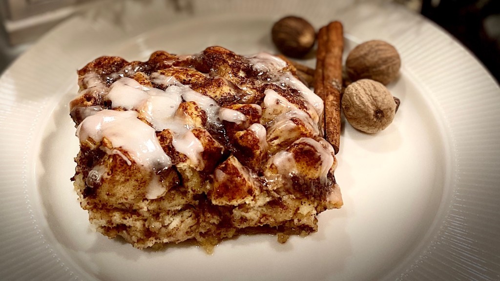 If you are making this the night before. Mix the wet ingredients in a bowl and place in the fridge. In the baking dish add the melted butter and cinnamon roll pieces. Place this dish in the fridge. The morning of, while the oven is preheating, pour the wet ingredients into the baking dish that has the butter and cinnamon roll pieces. Then bake.