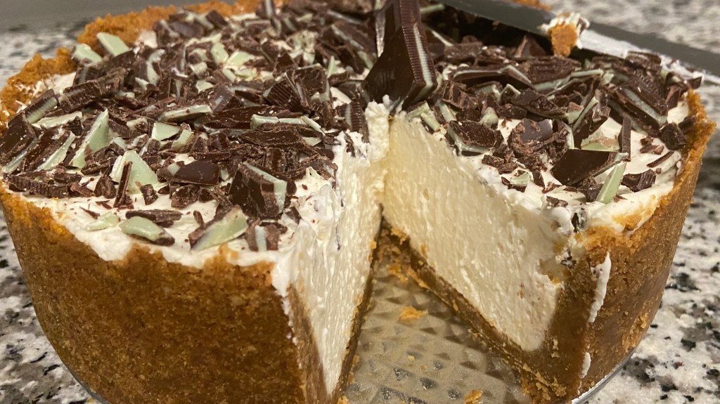 - This is where the Irish “takes the cake”. With your chopped Andes mints garnish the top of your cheesecake.